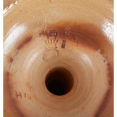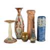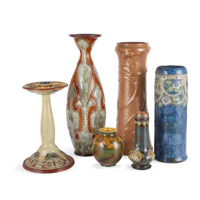 glazed stoneware, impressed manufacturer's mark, incised initials, 33cm (13in) high; together with a FRANK BUTLER DOULTON VASE, glazed stoneware, impressed manufacturer's mark, incised initials, 35.5cm (14in) high; a MARION HOLBROOK CANDLESTICK, glazed stoneware, impressed manufacturer's mark, incised initials, 22.5cm (8 7/8in) high; a VASE, glazed stoneware with impressed manufacturer's mark, incised initials, 15.2cm (6in); a TALL VASE, glazed stoneware, impressed manufacturer's mark, incised initials, 26.5cm (10 1/2in) high; and a DOULTON IVORYWARE VASE, 10cm (4in) high