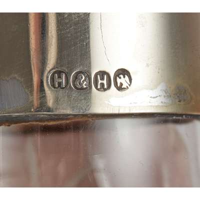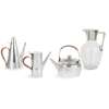 comprising a CLARET JUG, clear glass with silver-plated mount 21cm (8 1/4in) ; a TEAPOT 16.5cm (6 1/2in) across; and a LIDDED JUG, 12.5cm (5in) high, each silver plate with wicker handle, all stamped H&H; together with a WILLIAM HUTTON & SONS LTD. TEAPOT, in the manner of Christopher Dresser, silver plate with wicker handle, 16.5cm (6 1/2in) high