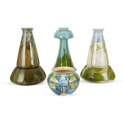 relief moulded and block printed earthenware, printed 'MINTON LTD.' , impressed date cypher and 'Minton' and '18', incised '3504', 31.7cm (12 1/2in) high; together with a SECESSIONIST WARE VASE, 1903, impressed date cypher and 'Minton', incised '3504', 31.7cm (12 1/2in) high; a SECESSIONIST WARE VASE, 1903, printed 'MINTON LTD.', impressed date cypher 'Mintons', incised '3509', 31cm (12 1/4in) high; and a SMALL SECESSIONIST WARE JARDINIÈRE, 1902, moulded 'MINTONS LTD.', impressed date cypher and 'Minton', printed '28', 11.5cm (4 1/2in) high