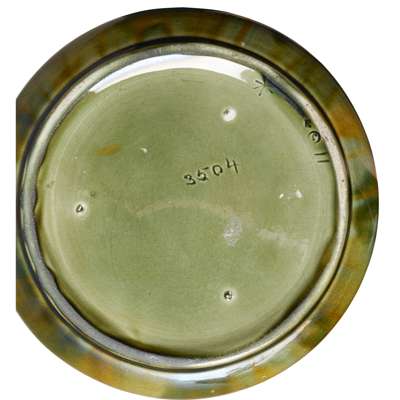 Designs produced for the range were heavily characterised by a raised linear decoration using the slip-trailed technique. This method involves piping liquid clay by hand to form a raised outline using a tubular tool, which was squeezed so that the mixture flowed. The coloured lead glazes were then painted within the raised outlines, sometimes overflowing the lines and mingling with each other, before the finished piece was fired. The coloured glazes are particularly striking in their rich polychromy of bold tones, likely inspired by Solon’s personal interest in this ancient practice.