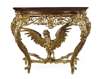 the shaped rouge marble top with outset rounded corners over a pierced and carved frieze of grapevines, raised on cabriole legs in the form of vine trunks united by an X-form stretcher centred by a giltwood figure of a winged mythological beast