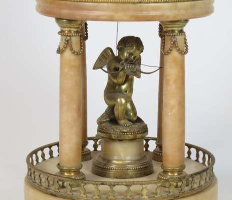 the white enamel revolving chapter rings, signed 'FESTEA, A. PARIS', surmounted by a flaming finial and raised on four turned pilasters, centred by a cupid seated on rocks and ending in a galleried platform base with bracketed feet