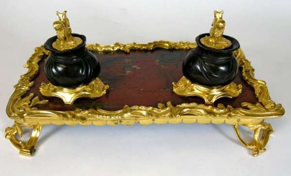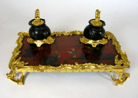 LOUIS XV STYLE LACQUER AND GILT BRONZE MOUNTED INKSTAND