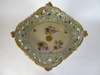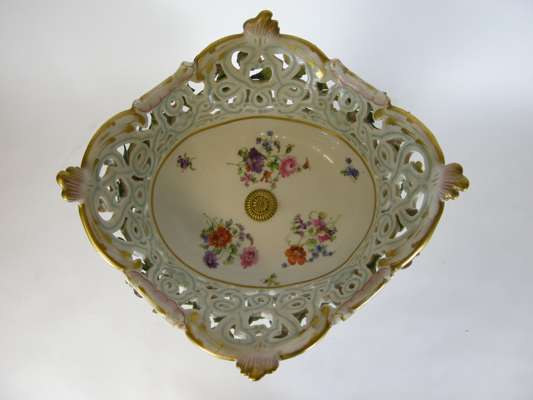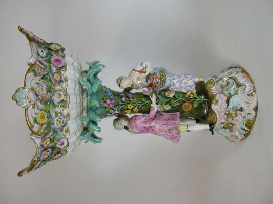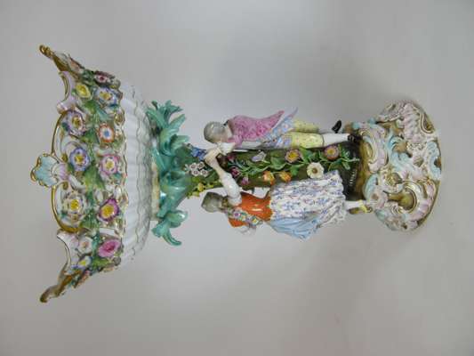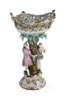 the pierced basket with relief decoration to the exterior and flower spray decoration to the well, the figural support modelled as a man and lady dancing, on a rococo style base, blue crossed swords mark and inscribed '2772'
