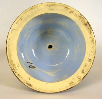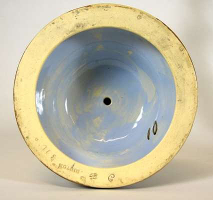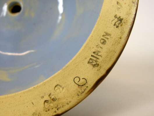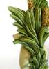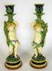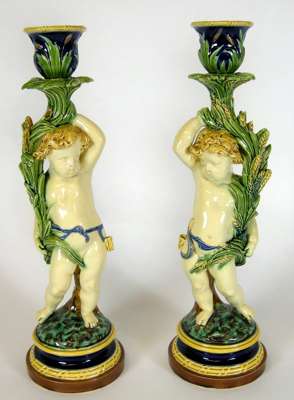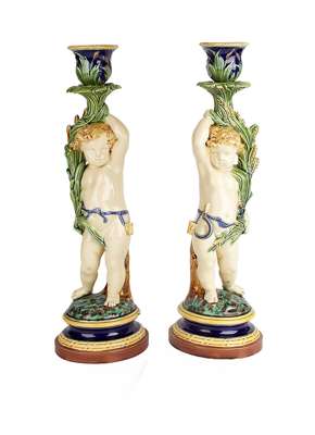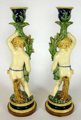 modelled as standing cherubs supporting wheatsheaf surmounted by candle nozzles, raised on circular bases, decorated in typical coloured glazes, impressed marks
