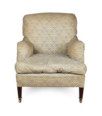 with rolled arms and back above a deep loose cushion seat, raised on square legs with brass castors, upholstered in Howard & Sons monogram print fabric