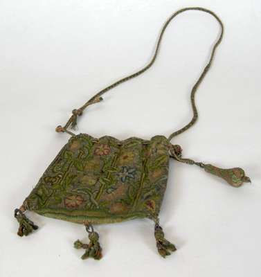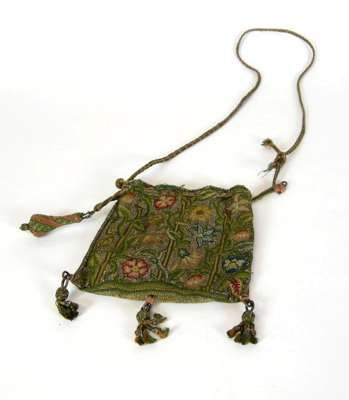 Note: Purses such as the present example were seldom used to hold money, more often used as for holding sewing supplies or 'sweet bags'. For a similar purse, see Victoria & Albert Museum , item 316&A-1898