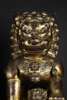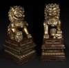 each carved in a seated position, one with a paw resting on a pierced ball, the other with a paw on a smaller lion; both with open mouths containing free-moving balls; raised on painted and parcel gilt pedestal bases carved with lobed bands and dragon panels (2)