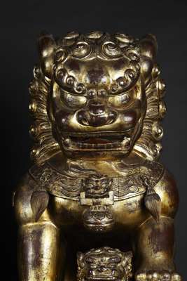 PAIR OF LARGE CHINESE CARVED, PAINTED AND PARCEL GILT TEMPLE LIONS