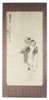 ink and colour wash on paper, depicting a gardener holding a small basket of flowers, calligraphy and seal marks, glazed and framed