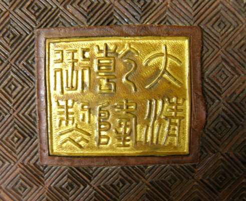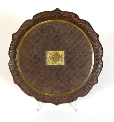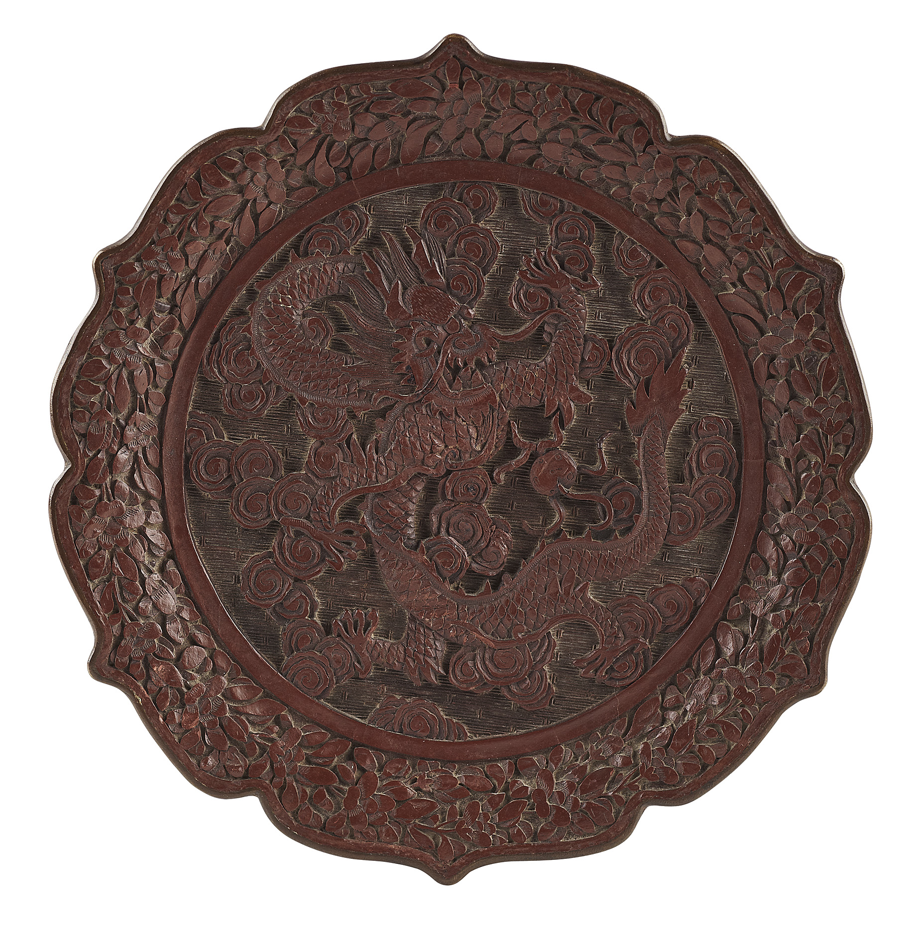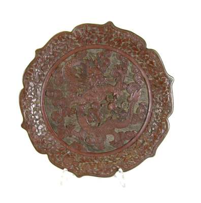 the barbed border with relief flowers and foliage enclosing a central dragon amidst clouds, the reverse with six character gold Qianlong seal mark, but later
