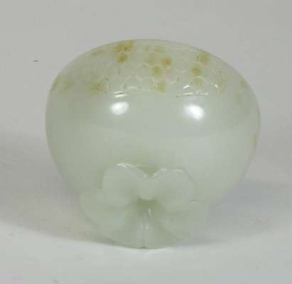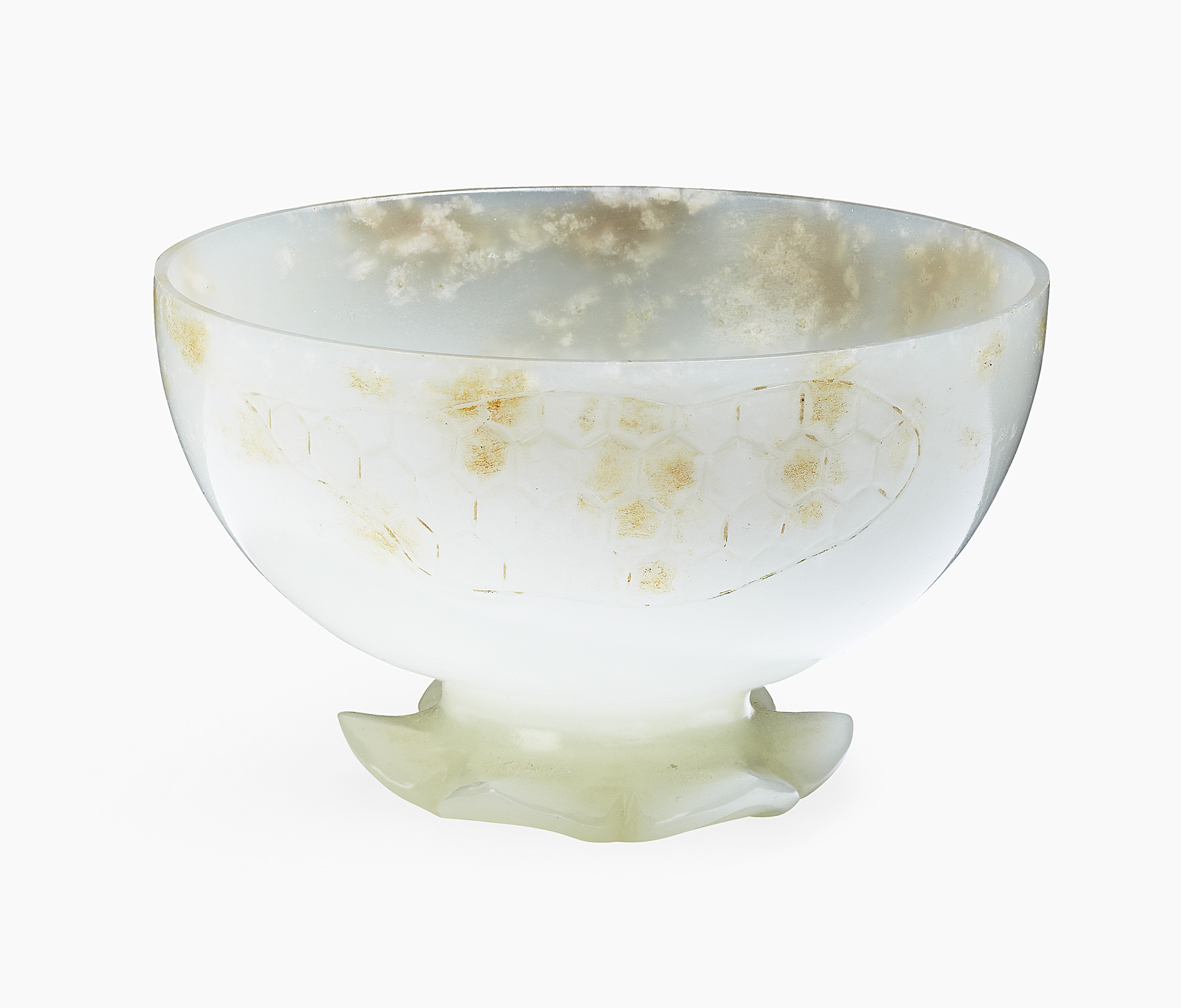 the exterior with a carved section revealing seeds, on a spreading sepals foot