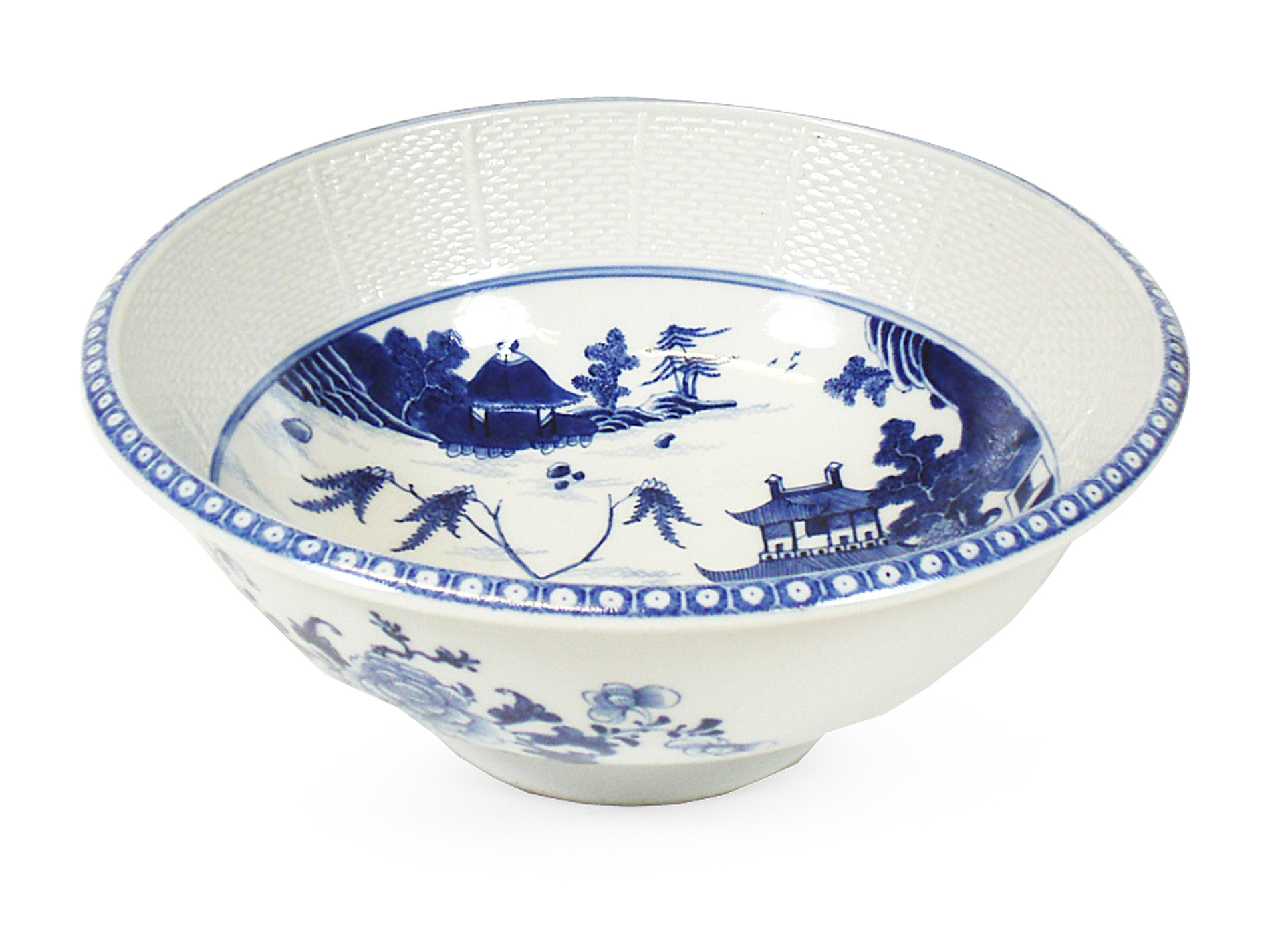 of circular form, decorated with a willow tree and a pavilion in a landscape, basket weave border, the exterior with sprays of peonies