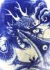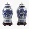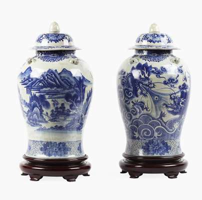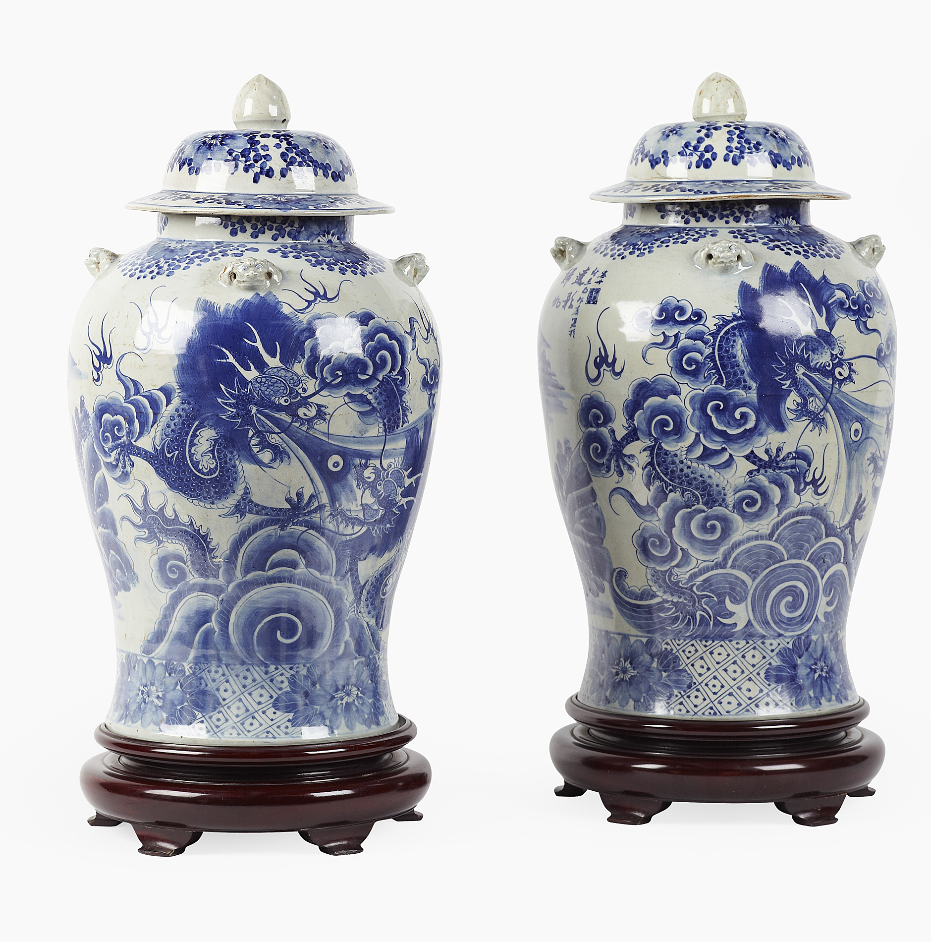 each with a cover with a lotus blossom finial and painted with prunus, above a baluster shaped body with bat head handles at the shoulder and painted with scrolling dragons to one side, the other side with a mountainous landscape and fishing hamlet with figures and pavilions, calligraphic poem inscription and maker's seal, on hardwood stands (2)