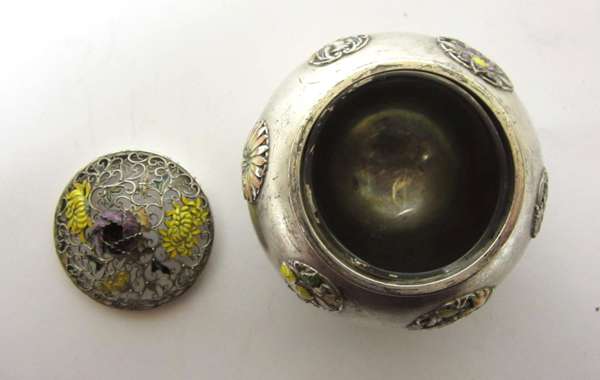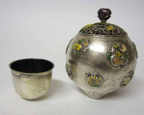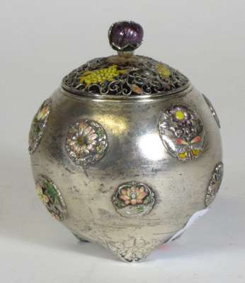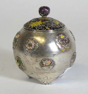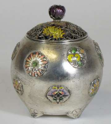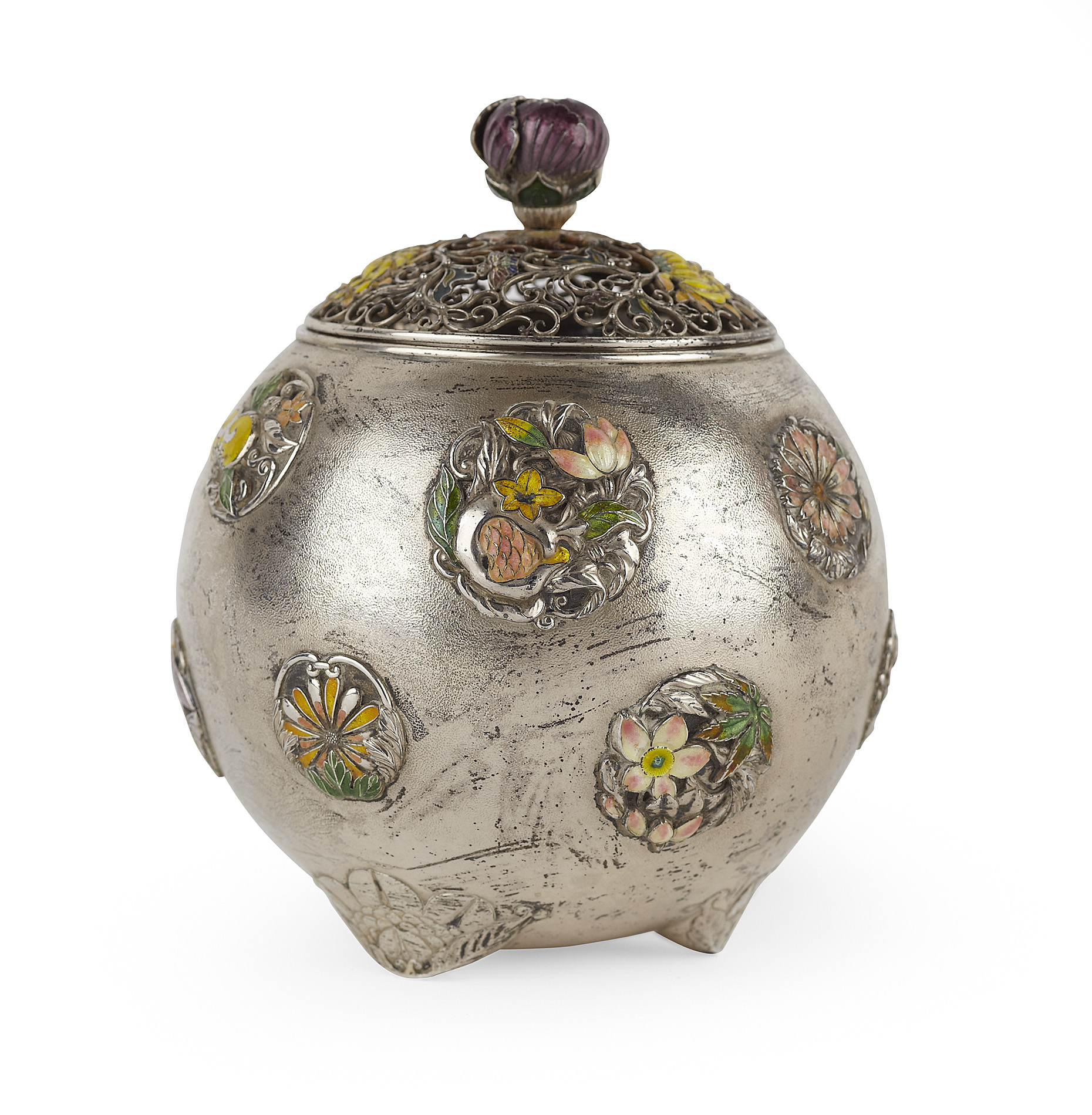 of globular form, the pierced wirework cover with yellow enamel chrysanthemum blossoms and a purple enamel floral finial, the body decorated with raised silver and enamelled roundels depicting flowers, and butterflies against a stippled ground, raised on flower form feet, two character mark