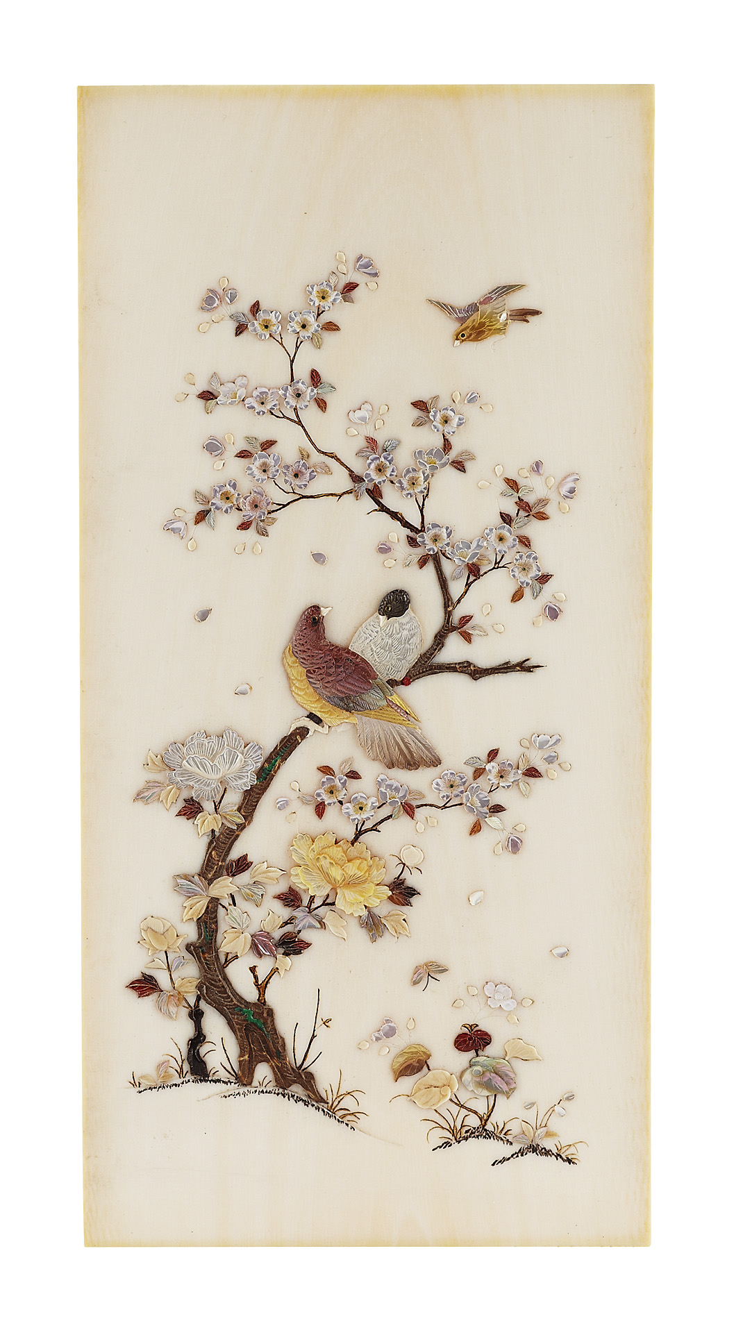 the rectangular plaque finely decorated with birds perched amongst prunus and peonies