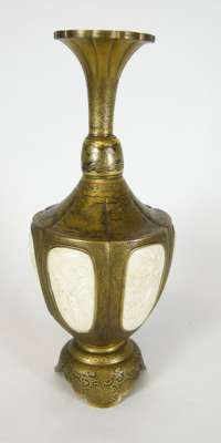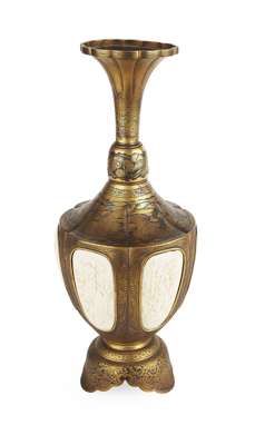 the flared neck and baluster sides finely engraved with cranes and sxcrolling foliage, inset with six foliate carved ivory panels and raised on a shaped foot