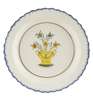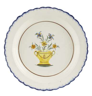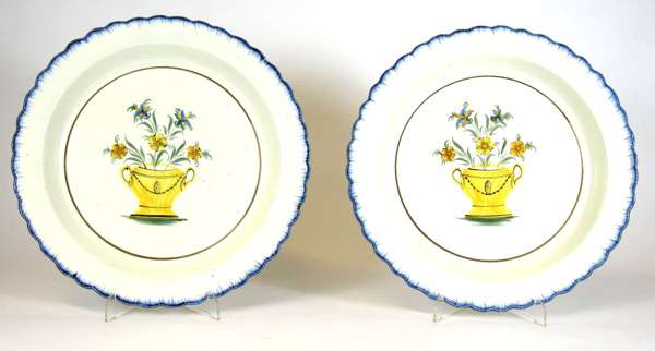 each with a blue glazed scalloped rim, centrally painted with a yellow urn containing flower sprays within a thin brown band (2)