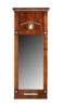 the straight cornice with a moulded egg and dart band over a pedimented panel set with an oval blue and white jasperware plaque, above a rectangular mirror plate marked at the corners and base with further plaques