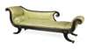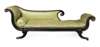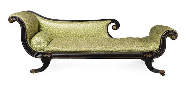 with gilt metal mounts, the scrolled back leading to a high scroll arm above a loose cushion seat, raised on reeded sabre legs ending in brass lion paw cappings and castors