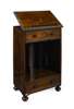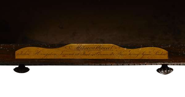 the ratchet adjustable top above one frieze drawer and an open shelf with two divisions, over a further apron drawer, raised on bun feet; the drawer bearing inlaid maker's label 'Musicathecal, John Hingston'