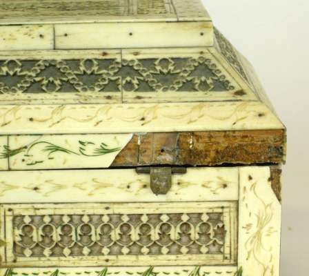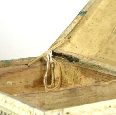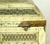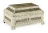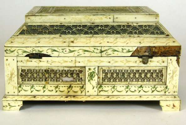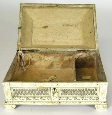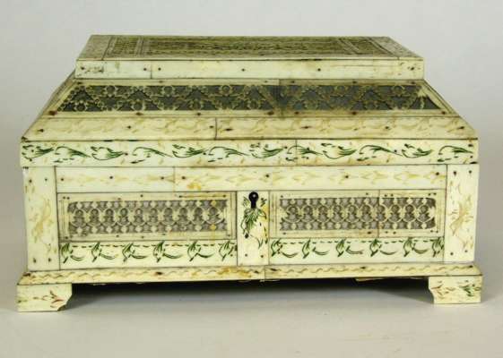 the hinged lid and sides with blind fret pierced panels, raised on bracket feet