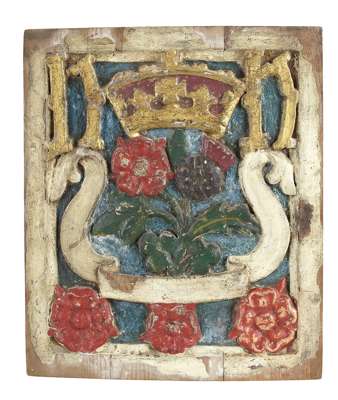 GROUP OF SIX CARVED PINE, GESSO AND POLYCHROMED ARMORIAL PANELS