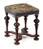 the square padded seat upholstered in floral needlework with a blue border, raised on turned and tapered legs joined by an X-form stretcher on flattened bun feet