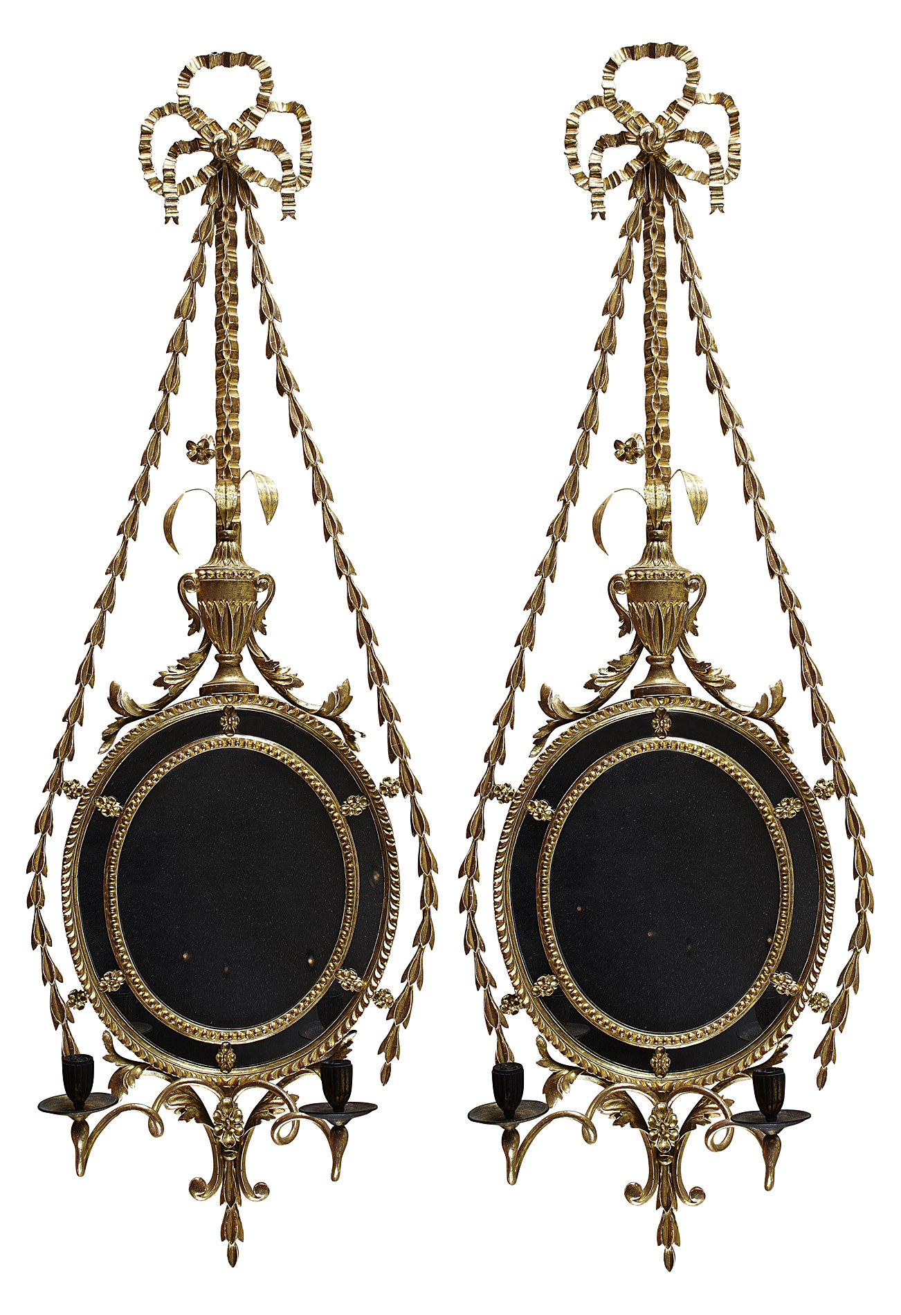 the oval mirror plates within further margin plates and gadrooned frames surmounted by flowering urns and ribbon-tied trailing husks, over a patera drop finial issuing two outscrolling candle arms (2)