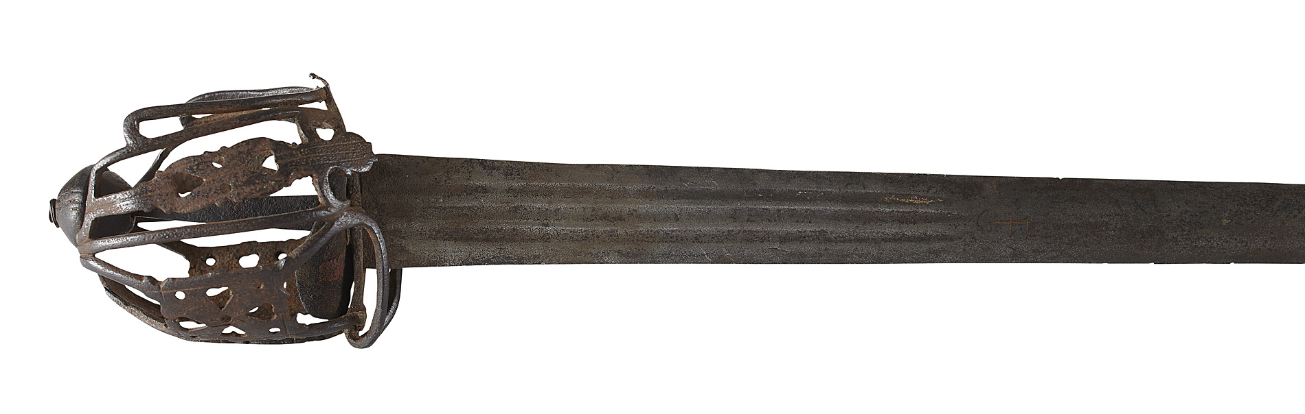 the hilt of round section bars, pierced with hearts in a traditional manner, a low bun shaped grooved pommel, grip missing, remains of a leather lining, a German double edged blade with three fullers for a quarter of the length