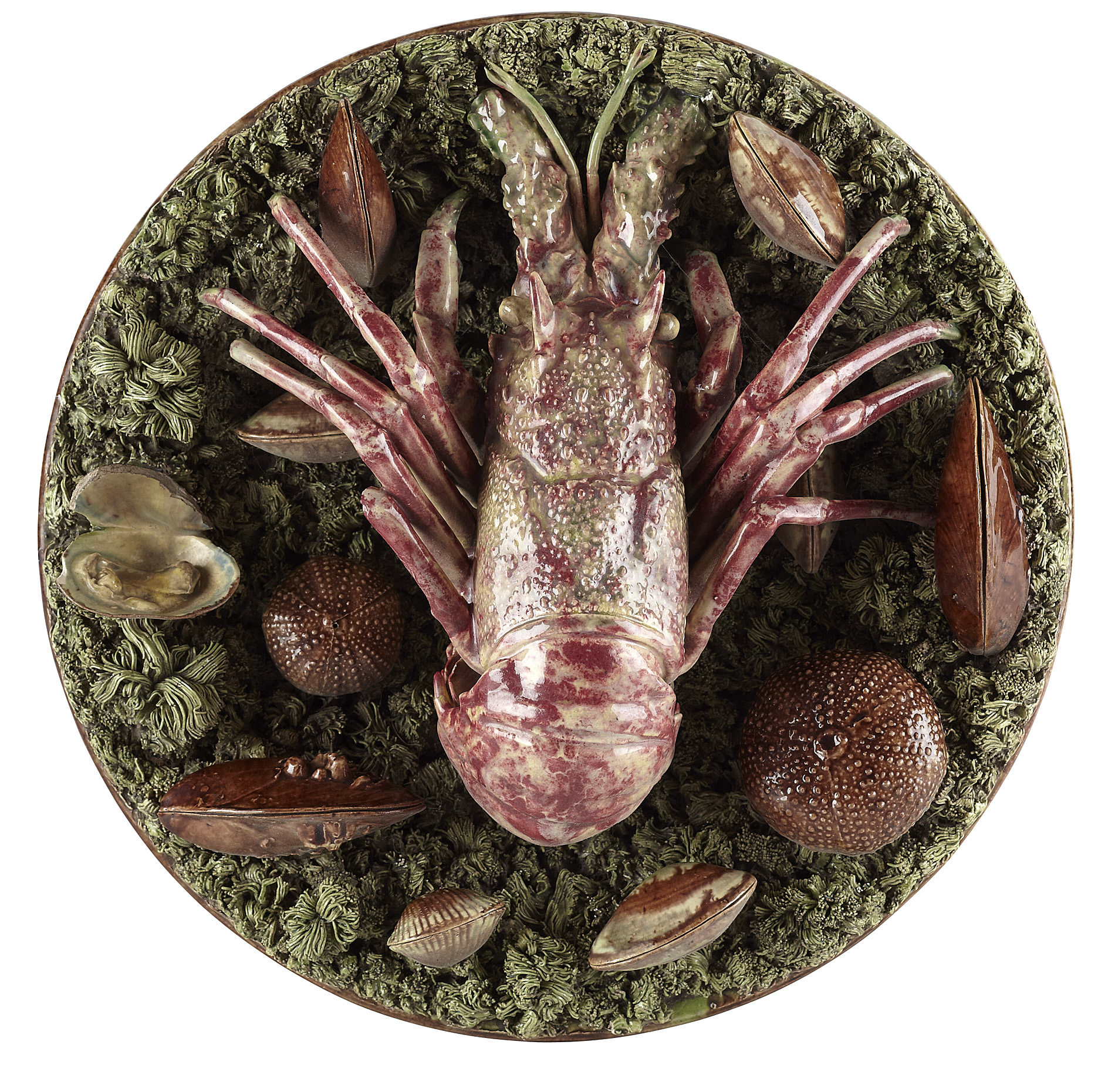 moulded and applied with a lobster, mussels, shells and a sea urchin on a mossy ground, impressed mark
