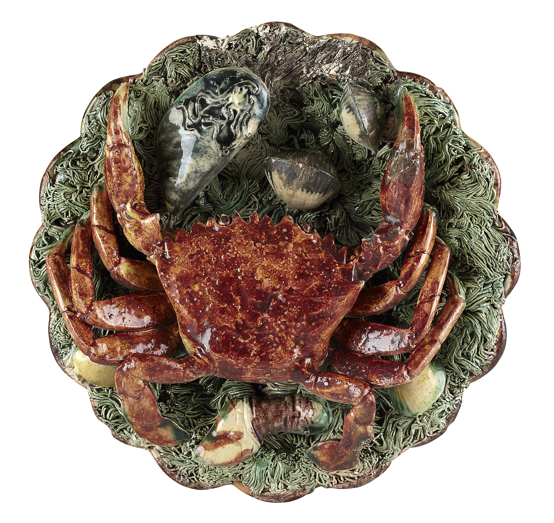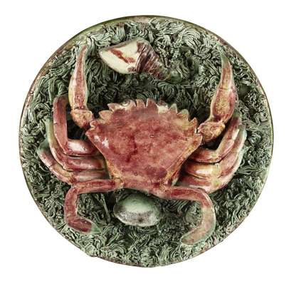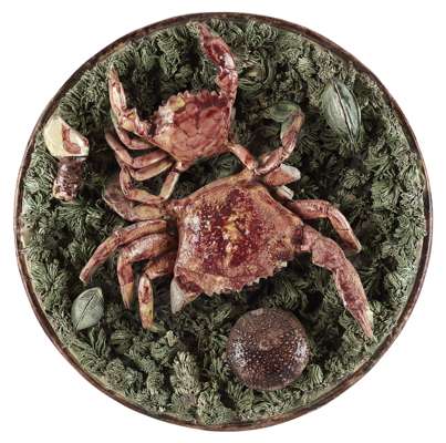 moulded and applied with a crab and assorted crustaceans on a mossy ground, with a fluted rim; together with two smaller plates of similar design, impressed marks (3)
