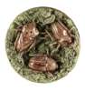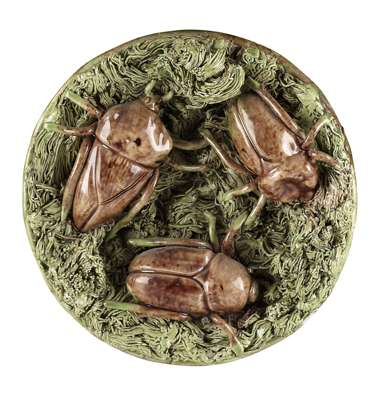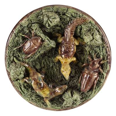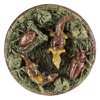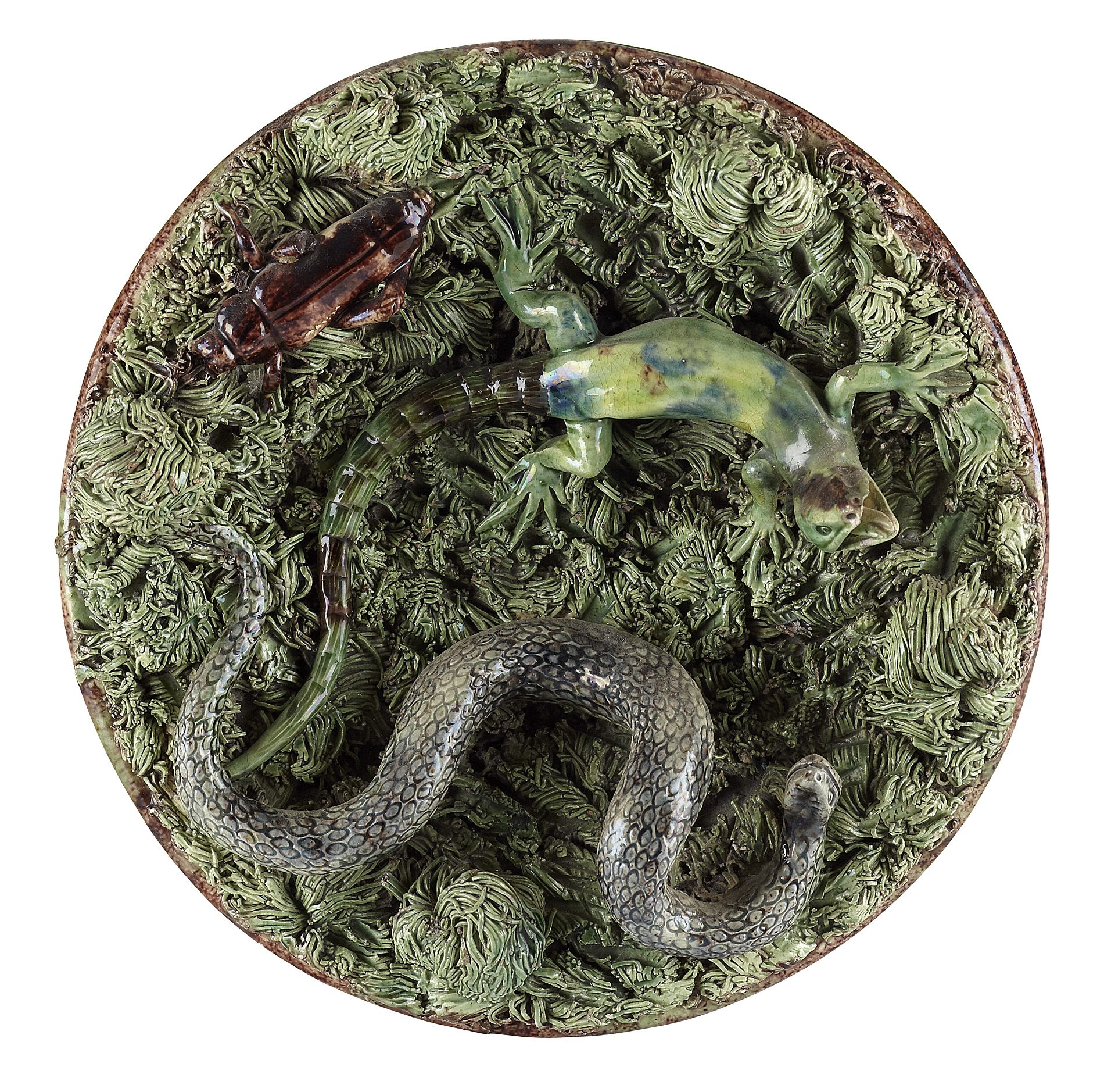 two moulded and applied with assorted snakes, lizards and beetles on a mossy ground, one by Manuel Mafra, the other with unclear maker's mark; together with two miniature Manuel Mafra plates with similar decoration, 11cm diameter, all with impressed marks (4)