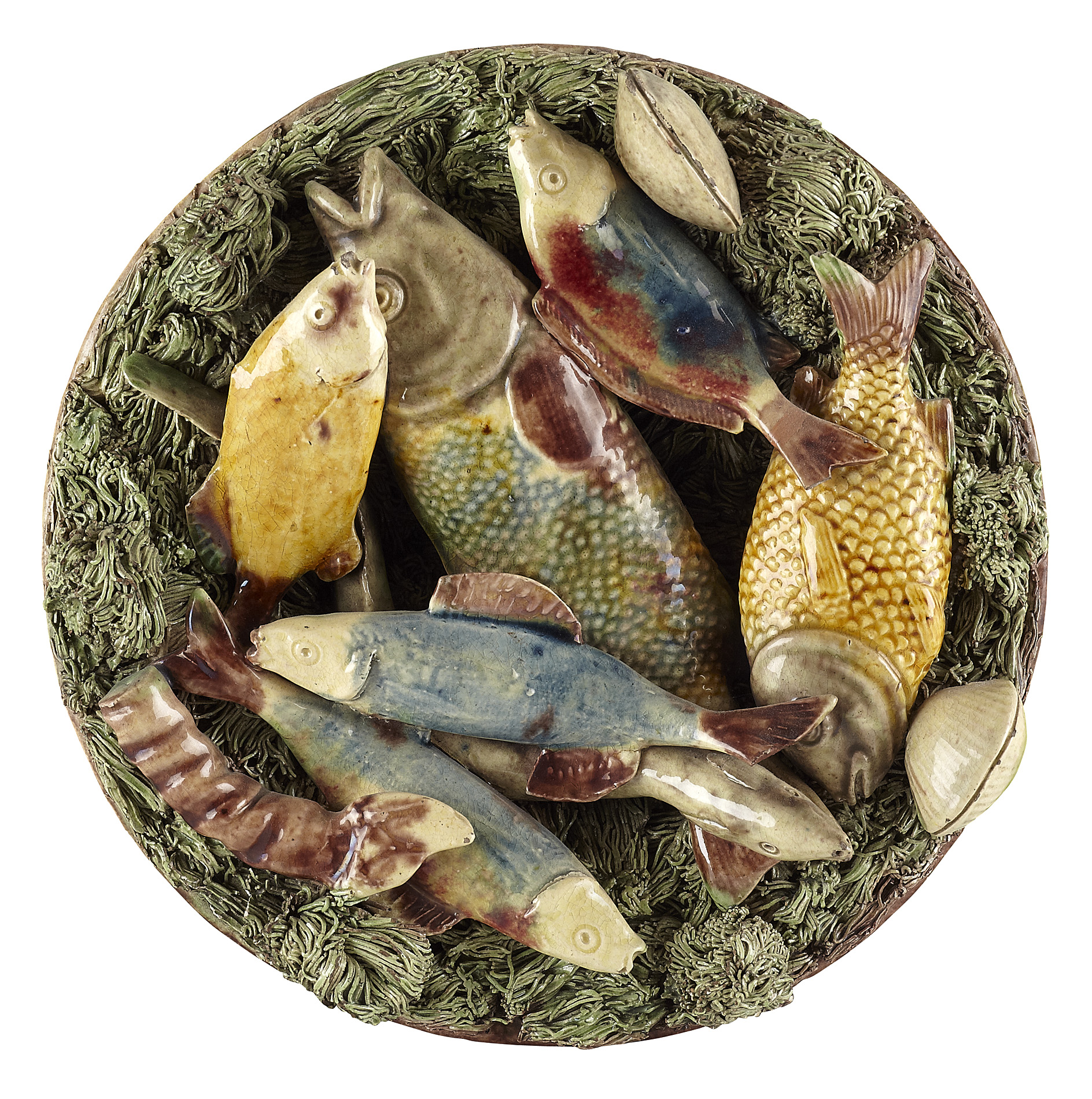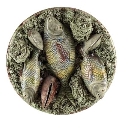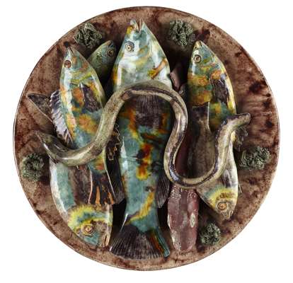 two plates by Manuel Mafra, moulded and applied fish and clams on a mossy ground, impressed marks; together with a further plate by José Alves Cunha, moulded and applied fish, an eel and mossy sprigs on a brown glazed ground, impressed mark (3)