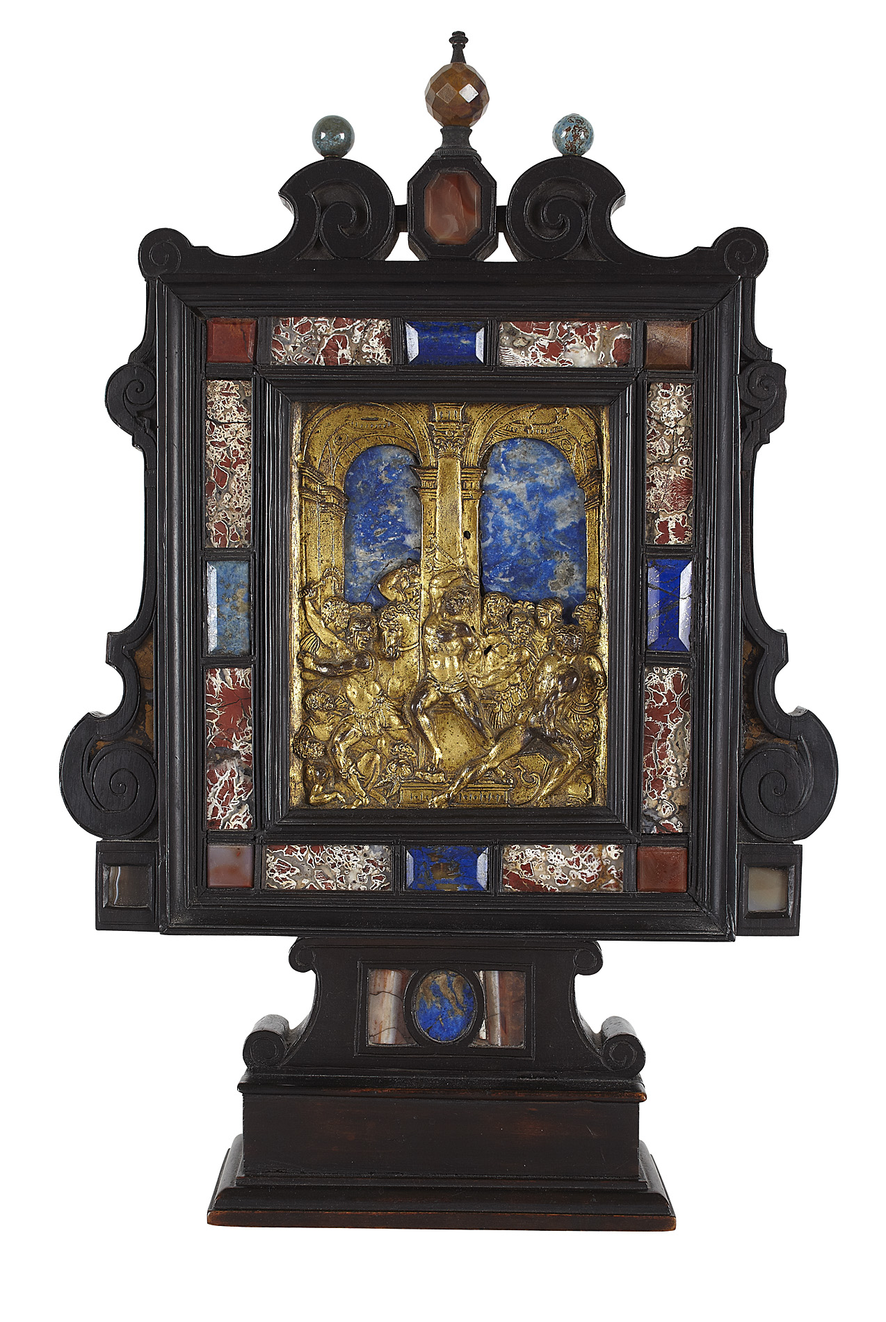 centred by a relief gilt metal plaque depicting the flagellation of Christ, the shaped frame inset with various hardstones surmounted by a facetted globular finial, raised on a square foot