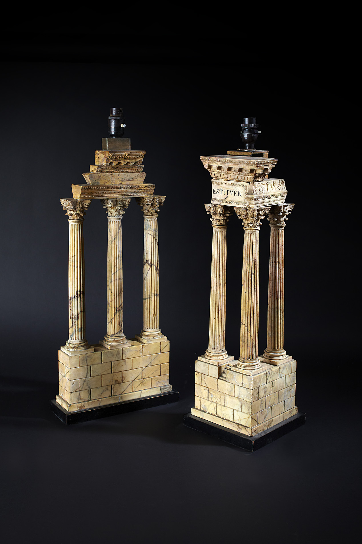 PAIR OF LARGE ITALIAN SIENNA MARBLE GRAND TOUR MODELS OF THE TEMPLES OF CASTOR AND POLLUX