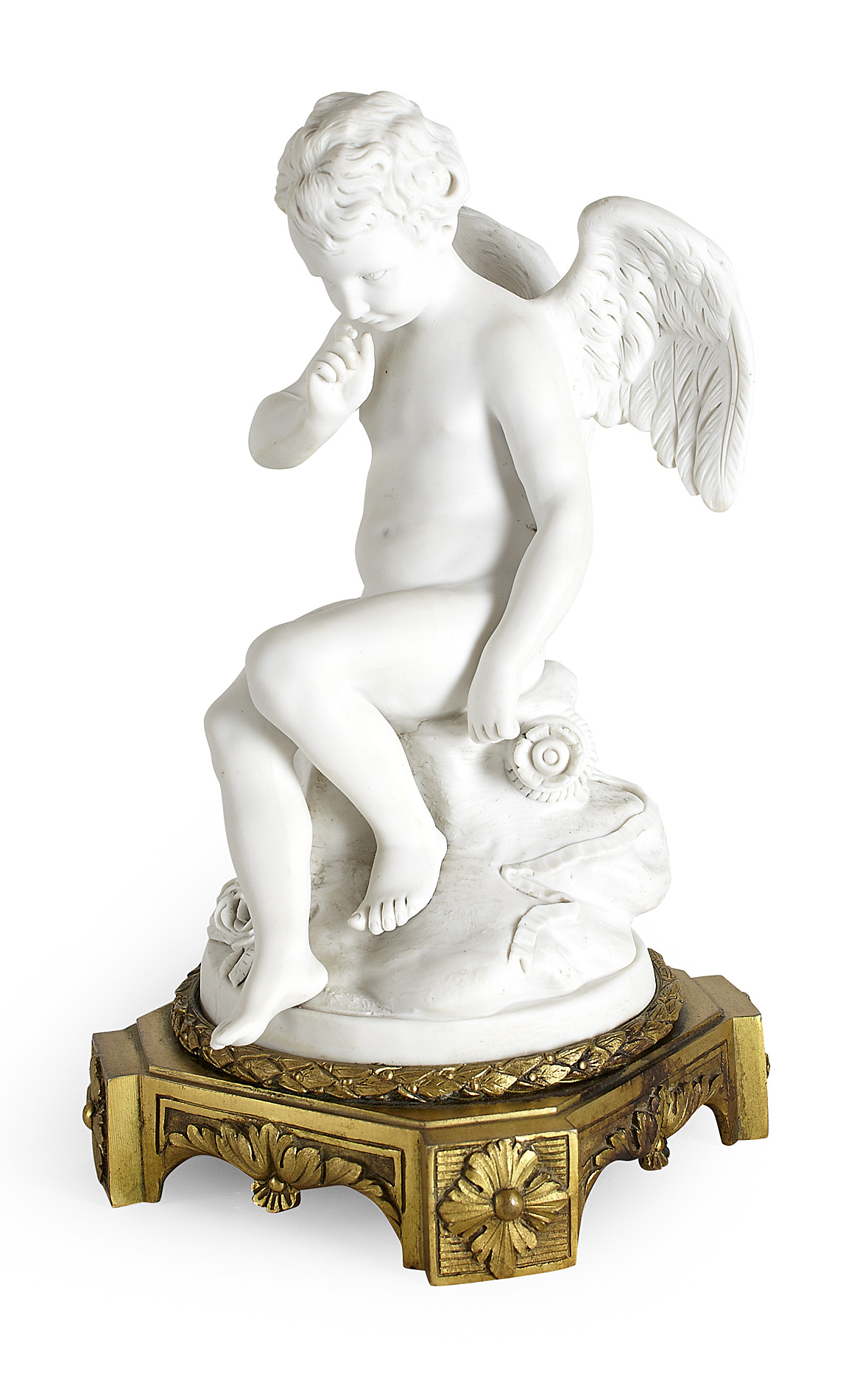 modelled as Cupid seated on a grassy mound and raising a finger to his lips, raised on a gilt bronze foliate cast square base