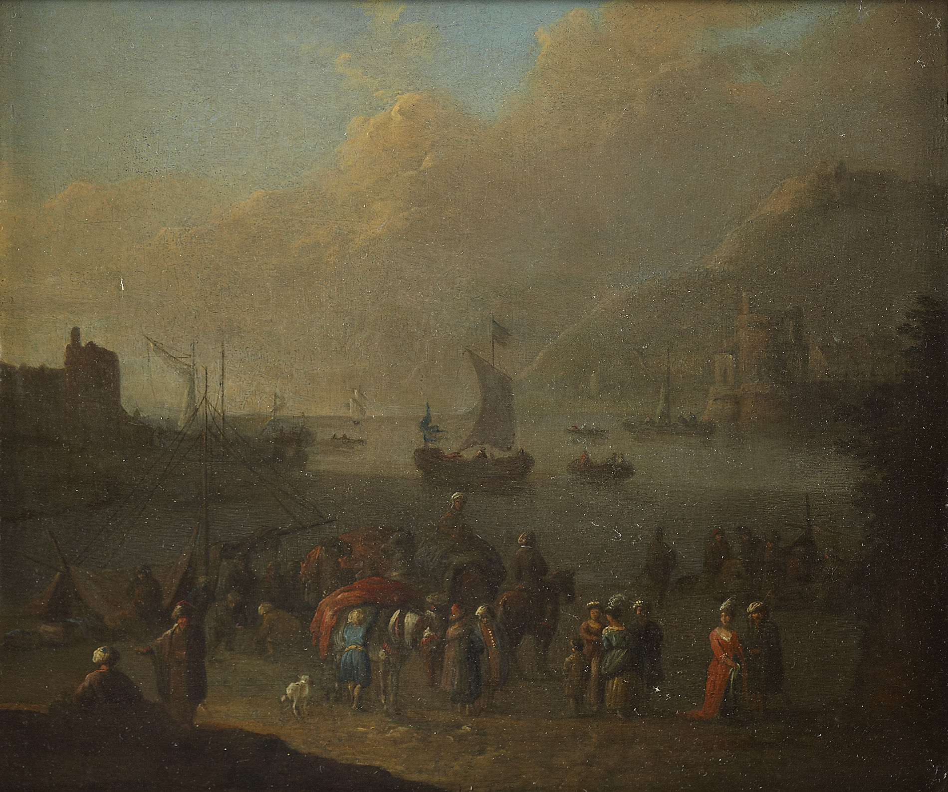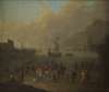 A BUSY COASTAL SCENE WITH FIGURES AND BOATS IN A HARBOUR