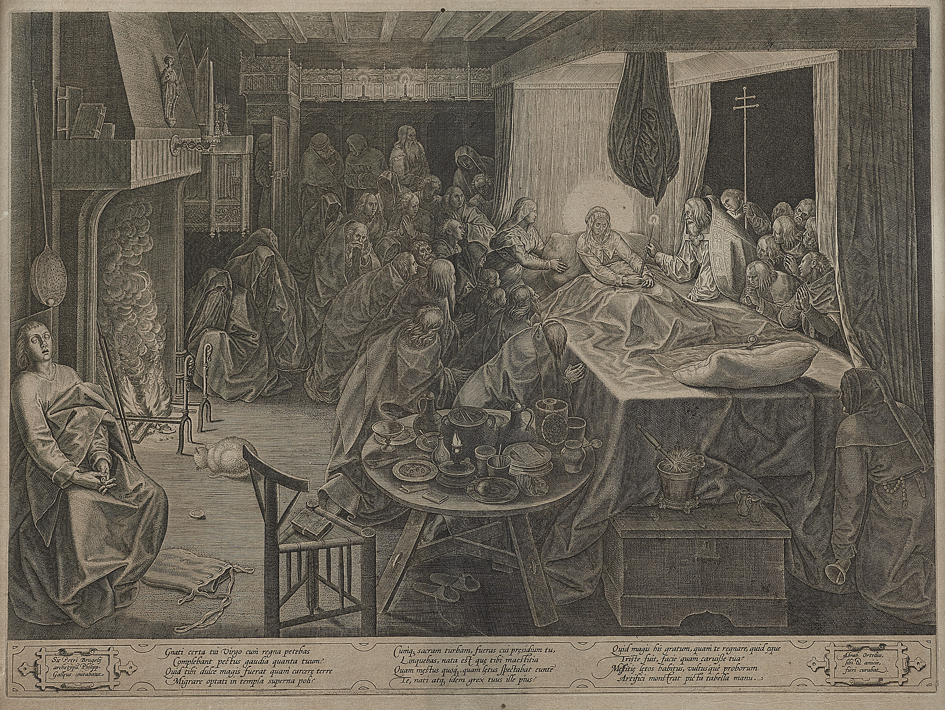 Inscription reads 'Thus Philipp Galle copied the archetype by Pieter Bruegel', and 'Abraham Ortelius and his friend attended to its making', accompanied by three Latin quatrains.