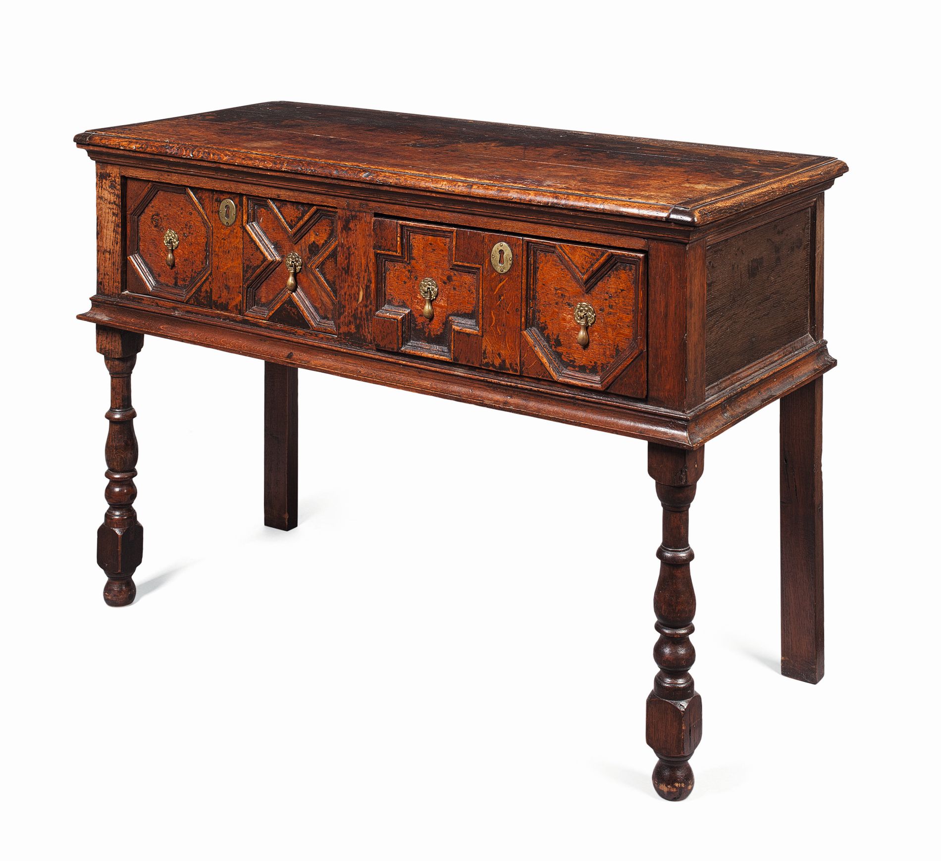 the moulded top above two mitre moulded drawers, raised on baluster turned legs, reduced in size