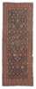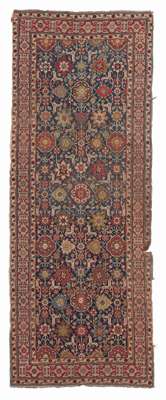 the abrash indigo field with Afshan pattern of rosettes and arabesque vine, within red kufic script border between lemon bands