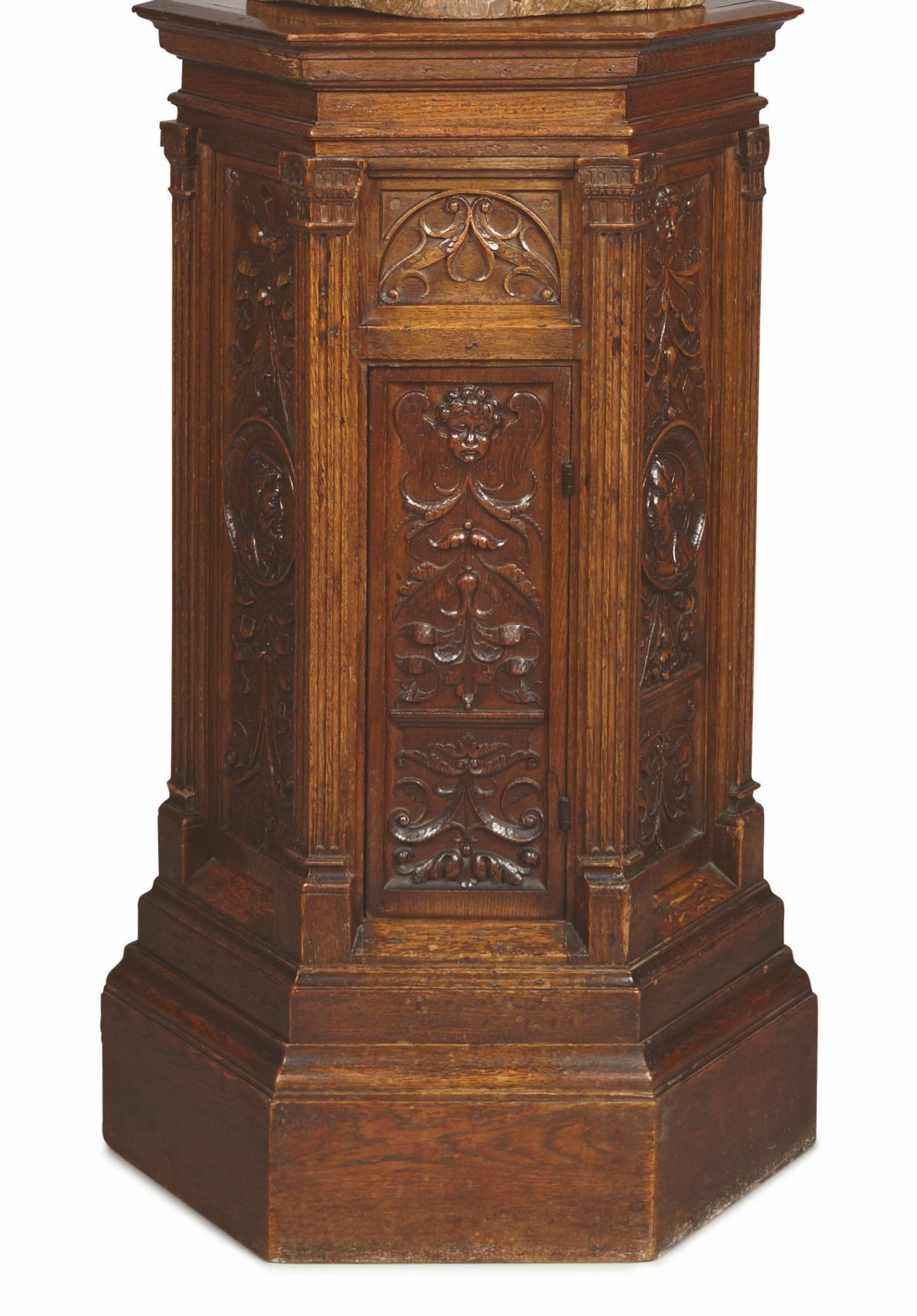 the hexagonal top above panelled sides incorporating a cupboard door carved in relief with foliate scrolls, portrait medallions and putti masks, flanked and divided by fluted pilasters, raised on a plinth base