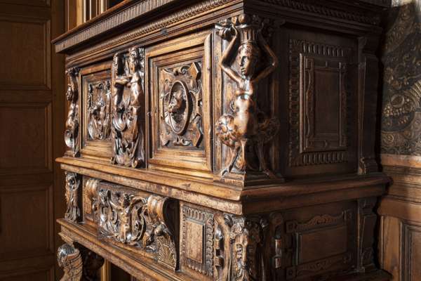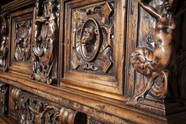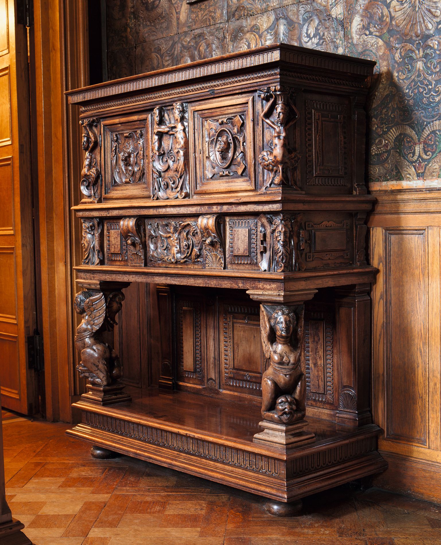 the rectangular top above a fluted frieze and two relief carved doors centred by leopard and lion medallions, flanked and divided by satyrs and caryatids; the lower part with an ornately carved figural and foliate scroll and panelled apron incorporating one cupboard door, raised on twin carved mythical figural supports united by an undertier and ending in squat bun feet