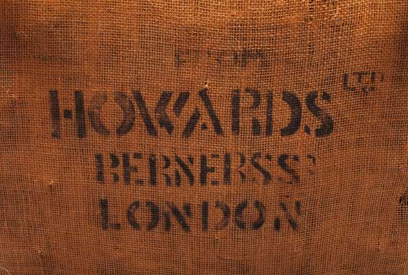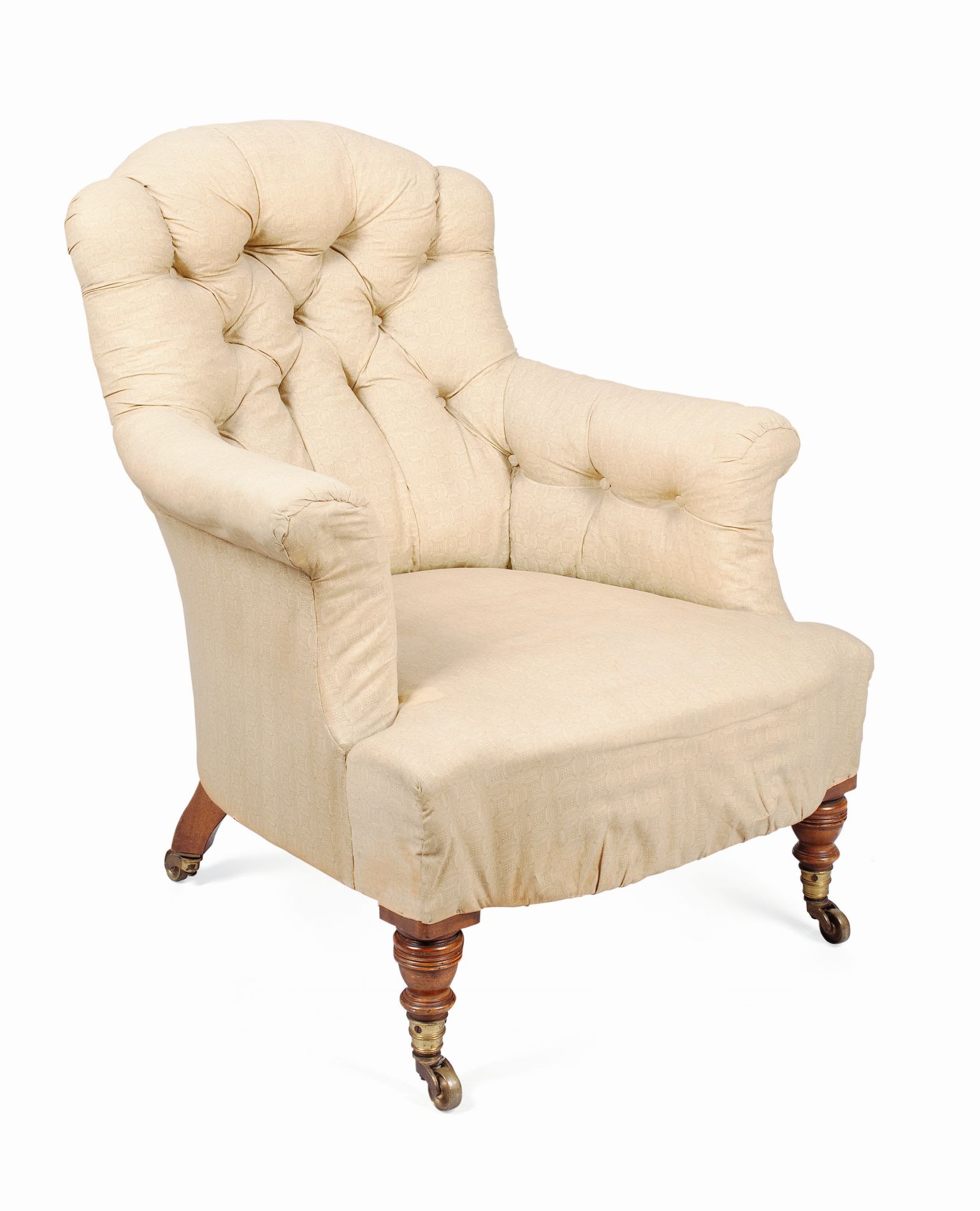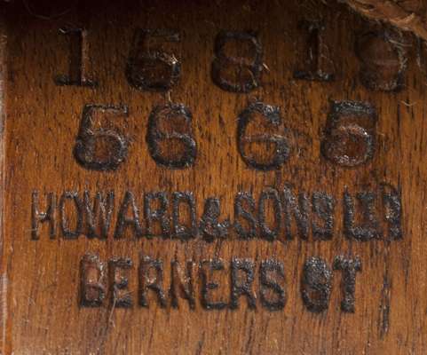 the button upholstered back and enclosed arms over a self seat, raised on turned legs with brass caps and castors, the leg stamped 15819/ 5665 Howard & Sons, Berners Street, also stamped on the castors, in original cotton upholstery