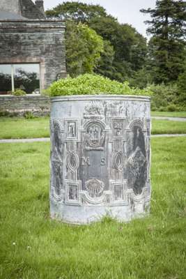 the cylindrical body cast with cartouches with the initials 'M S', shells, and angels