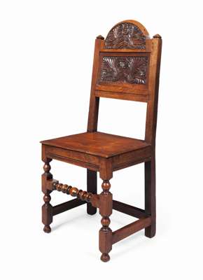 the arched back panel carved with stylised tulips and roses above a plank seat, raised on turned legs united by peripheral stretchers