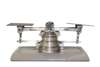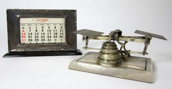 the silver frame and platforms with a set of five weights, mounted on a rectangular onyx base; together with a GEORGE V SILVER MOUNTED AND EBONISED PERPETUAL DESK CALENDAR, Birmingham, 1929, Patent No 9964, 20cm wide, 13cm high, 5cm deep (2)