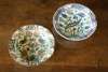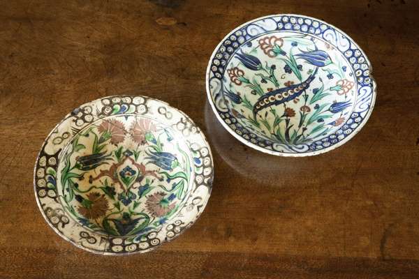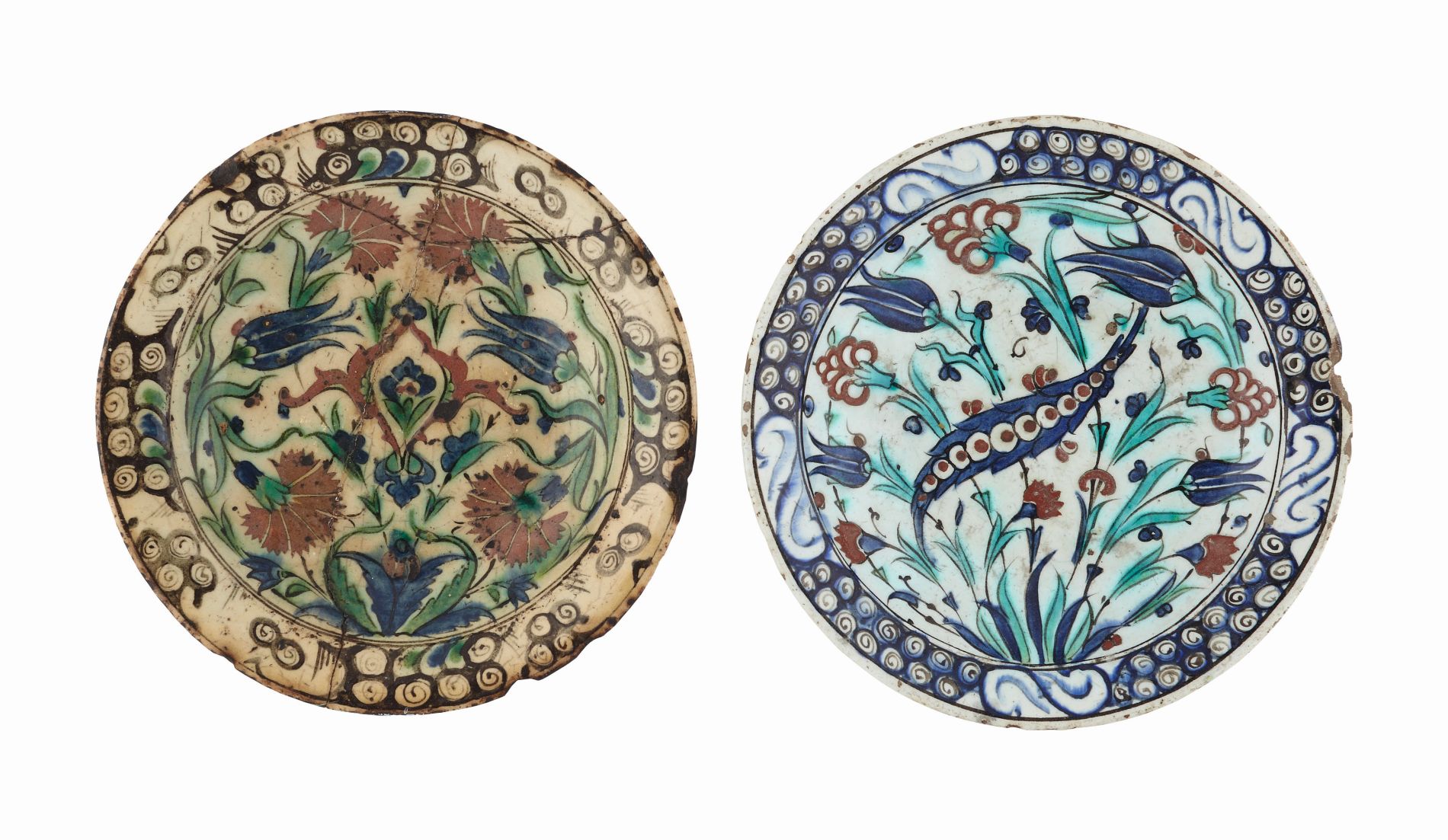 the first decorated with a saz leaf and tulips within a scroll border, 26cm diameter; the other decorated with carnations and tulips within a scroll border, 25cm diameter (2)