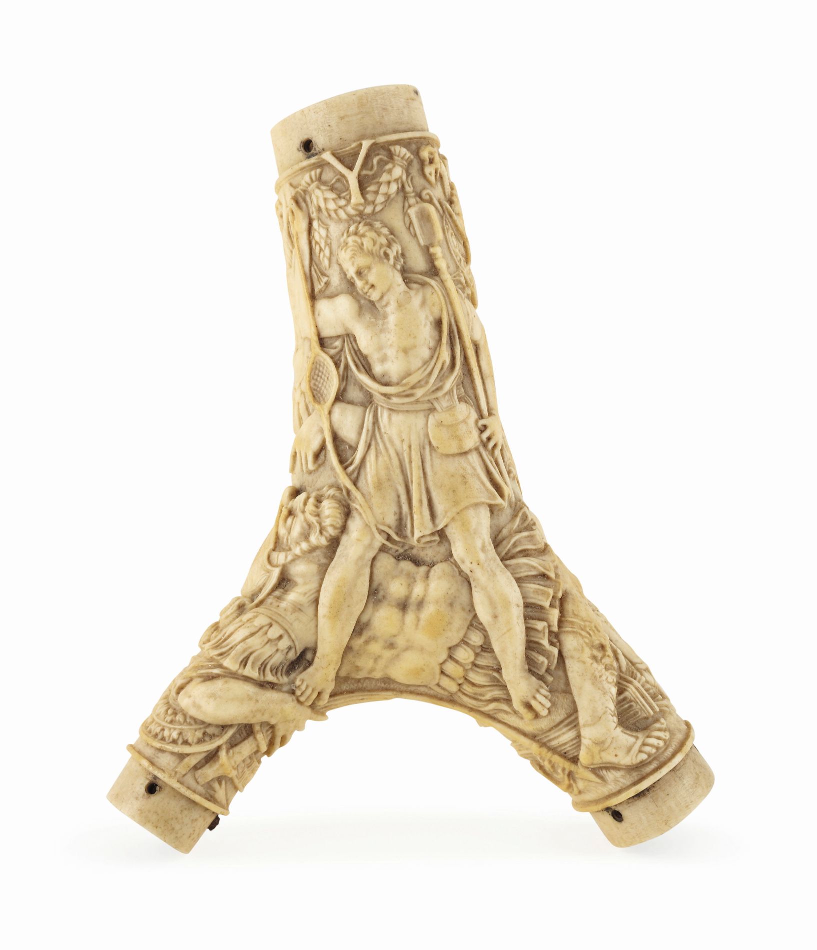 the Y-section carved in relief depicting a triumphant David holding a sling and standing over the fallen Goliath, the reverse inscribed with a heraldic crest and motto