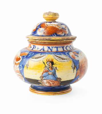 the squat bulbous body with a domed cover with flattened knop, painted in blue, yellow, brown, black and white in the centre within a panel the emblem of an enthroned queen with crown and sceptre below a curtain and above a label with the inscription ''.P.ANTICO.' on a ground of trophies of arms and musical instruments on a blue ground; one of the armorial helmets with the mark of an unknown monastic pharmacy consisting of a patriarchal cross flanked by the letters D O.